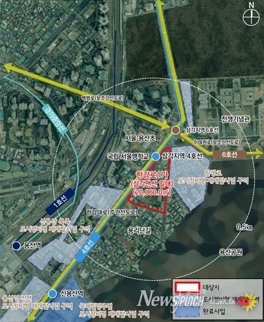 한강로1가 도시정비형 재개발구역은 지하철 4, 6호선 삼각지역 역세권 내에 위치하여 2025 도시환경정비기본계획(2016)에 따라 정비예정구역으로 지정되어 도심 기능연계, 노후 주거환경 정비 등을 목표로 용산구에서 정비구역 지정 및 정비계획(안) 마련을 추진했다.
