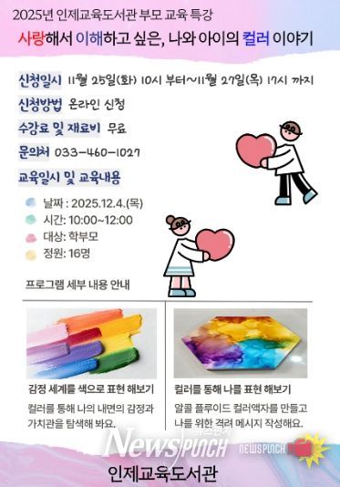 뉴스펀치 김길룡 기자 | 인제교육도서관은 12월 4일 10시 학부모 16명을 대상으로 ‘부모 교육 특강’을 운영한다.