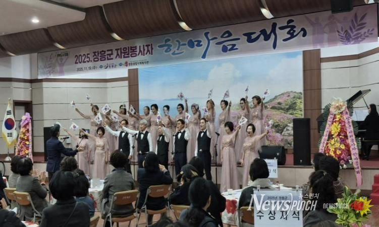 뉴스펀치 김길룡 기자 | 장흥군 노인복지관은 19일 열린 자원봉사자 한마음대회에서 노인복지관 프로그램 참여 어르신들로 구성된 정남진 시니어합창단이 축하공연을 펼쳤다고 밝혔다.