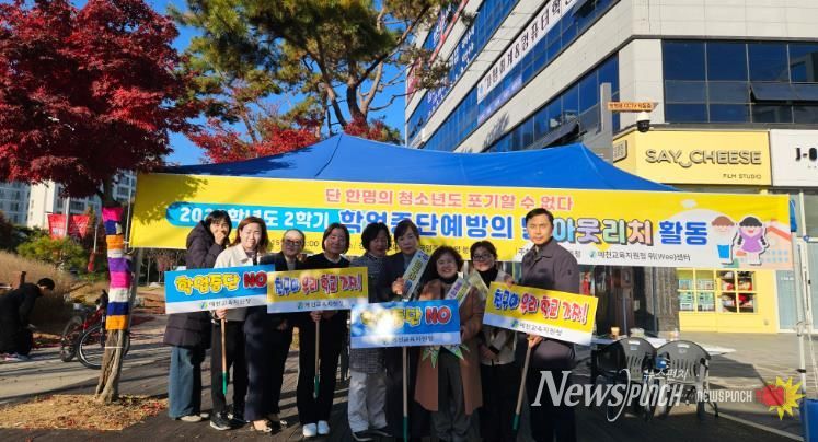 뉴스펀치 김길룡 기자 | 경상북도예천교육지원청은 11월 19일 경북도청신도시 분수대 광장에서 학생상담자원봉사자연합회 회원 및 업무 관계자 15명이 참석한 가운데 학업중단 예방을 위한 아웃리치 활동을 전개했다.