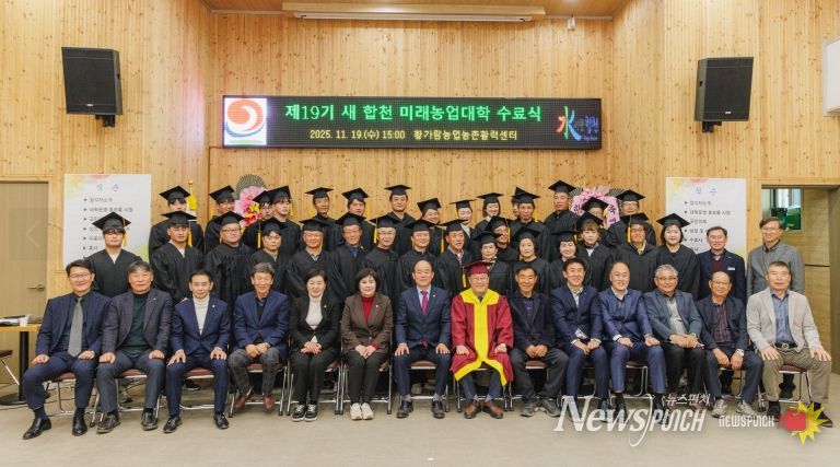뉴스펀치 김길룡 기자 | 합천군은 11월 19일 황가람 농업농촌활력센터에서 제19기 새 합천 미래농업대학 수료식을 개최했다. 행사에는 수료생과 기관·단체장 등 63명이 참석해 지난 9개월간의 교육 성과를 함께 축하했다.