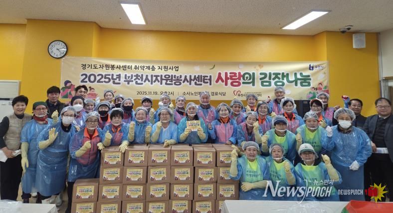 뉴스펀치 김길룡 기자 | 부천시는 지난 19일 부천시자원봉사센터가 ‘2025 사랑의 김장나눔’ 행사를 열고, 관내 5개의 복지기관을 통해 취약계층 375가구에 겨울철 김장김치를 전달했다고 20일 밝혔다.