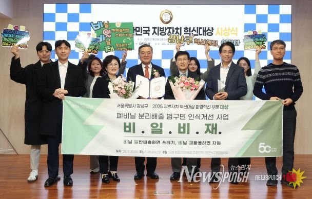뉴스펀치 김완규 기자 | 꿈이 모이는 도시, 미래를 그리는 강남구가 ‘2025 대한민국 지방자치 혁신대상’에서 환경혁신 부문 대상을 수상했다. 폐비닐 분리배출 촉진을 위해 전국 최대 규모의 전용봉투를 보급하고, 민관 협력을 통해 자원순환 시스템을 구축한 점이 높은 평가를 받았다.