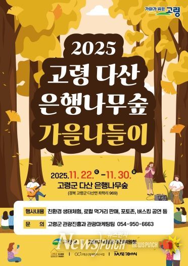 뉴스펀치 김길룡 기자 | 고령군과 고령♡낙동강 추진위원회(위원장 성현덕)는 단풍 절정 시기에 맞춰 오는 11월 22일부터 30일까지 토·일 중심으로 다산 은행나무숲 일대에서 ‘고령 다산 은행나무숲 가을나들이 행사’를 개최한다.