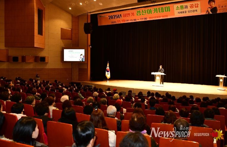 뉴스펀치 김길룡 기자 | 경산시는 19일 경산시민회관 대강당에서 시민 600여 명이 참여한 가운데 『2025년 하반기 경산 아카데미』를 성황리에 개최했다. 이번 경산 아카데미는 숭실사이버대학교 학과장 이호선 교수를 초청하여‘소통과 공감, 지혜로운 인간관계’라는 주제로 진행됐다.
