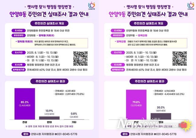 앞서 시는 8월 1일부터 10월 13일까지 안양8동과 안양9동에 거주하는 전 세대주민을 대상으로 안양8동을 명학동으로, 안양9동을 병목안동으로 변경하는 것에 대해 찬반조사를 실시했다.