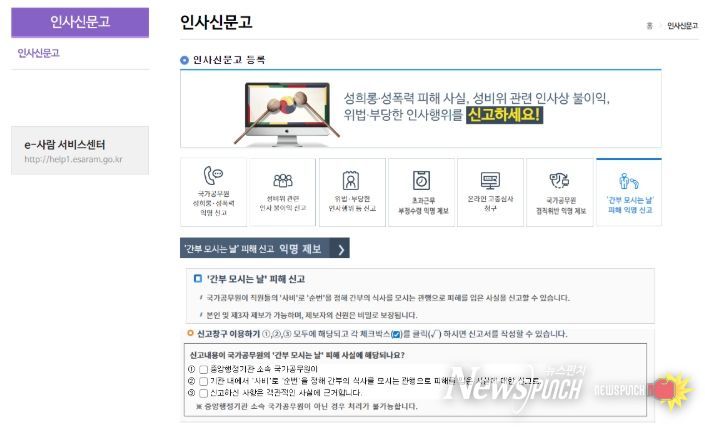 인사혁신처는 ‘간부 모시는 날’ 피해 익명 신고센터를 전자인사관리시스템(e-사람) 내 설치하고, 중앙행정기관 소속 공무원을 대상으로 피해 접수를 시작했다고 21일 밝혔다.