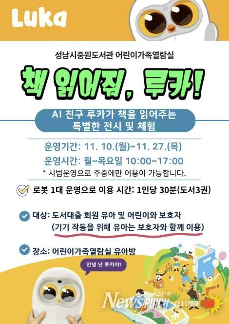 뉴스펀치 김길룡 기자 | 성남도시개발공사 중원도서관은 지역 어린이들에게 인공지능(AI) 기술을 활용한 새로운 독서 체험 기회를 제공하기 위해 ‘책 친구 로봇, 루카(LUKA)’를 오는 12월까지 운영한다고 21일 밝혔다.