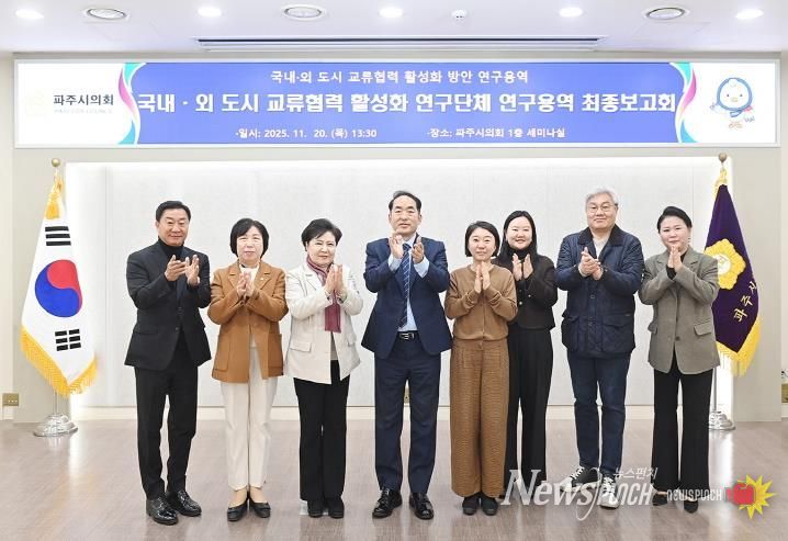 뉴스펀치 김길룡 기자 | 파주시의회 의원연구단체인‘국내·외 도시 교류협력 활성화 연구단체’는 20일, 파주시의회 1층 세미나실에서‘국내·외 도시 교류협력 활성화 방안에 대한 연구용역 최종보고회’를 개최했다고 밝혔다.