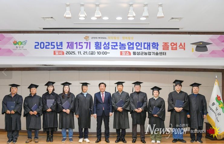 뉴스펀치 김길룡 기자 | 횡성군농업인대학은 21일 횡성군농업기술센터에서 ‘2025년 제15기 횡성군농업인대학 졸업식’을 진행했다.