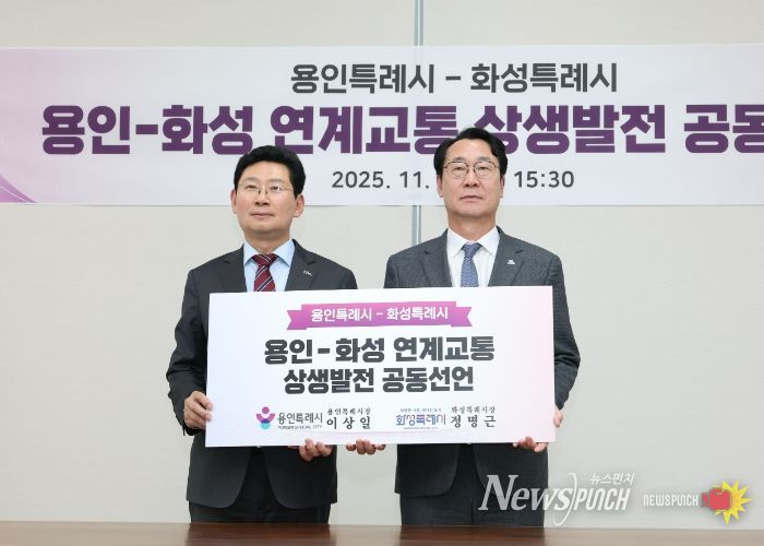 뉴스펀치 김길룡 기자 | 화성특례시와 용인특례시는 21일 고양시청 백석별관 투자회의실에서 ‘화성-용인 연계교통 상생발전 공동선언문’을 발표하고, 반도체 메가시티의 핵심 축으로서 양 도시가 긴밀히 협력할 것을 천명했다.