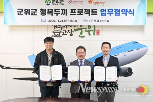 뉴스펀치 김길룡 기자 | 군위군은 21일 행복나래 주식회사, 행복도시락사회적협동조합과 함께 '군위군 행복두끼 프로젝트' 업무협약을 체결했다. 이날 협약식에는 김진열 군수를 비롯해 행복나래(주) 조민영 본부장, 행복도시락사회적협동조합 최준 사무국장이 참석했다.