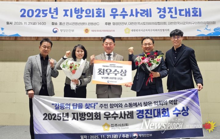 뉴스펀치 김길룡 기자 | 진주시의회는 지난 21일 행정안전부가 주최한 ‘2025년 지방의회 우수사례 경진대회’에 주민참여 부문으로 참가해 최우수상을 거머쥐는 기쁨을 누렸다.