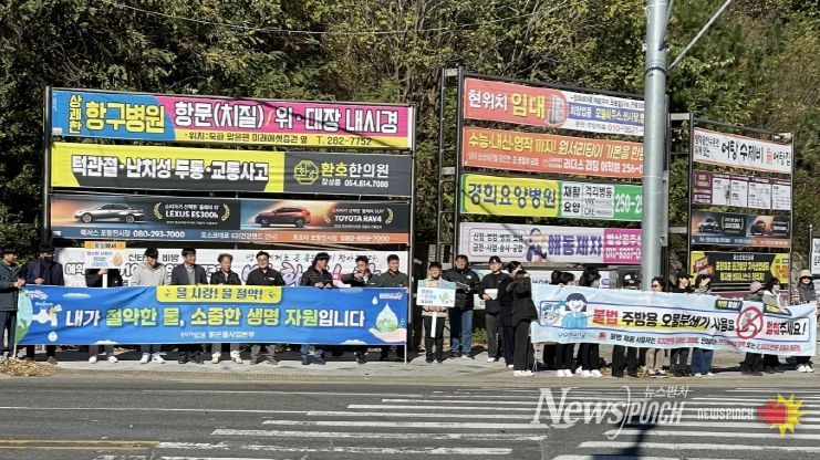 뉴스펀치 김길룡 기자 | 포항시는 21일 장성동 두산위브사거리 일원에서 ‘시민과 함께하는 물 사랑’ 캠페인을 진행하며 생활 속 물 절약 실천과 불법 오물분쇄기 사용 근절을 홍보했다.