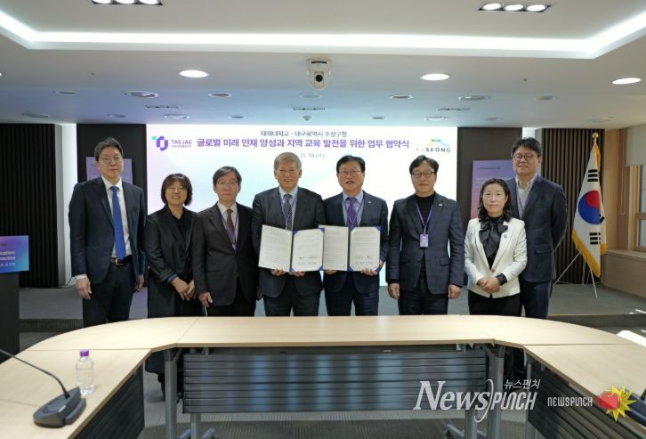 뉴스펀치 조평훈 기자 | 대구 수성구는 지난 19일 태재대학교(총장 염재호)와 글로벌 미래 인재 양성 및 지역 교육 발전을 위한 업무 협약(MOU)을 체결하고 상호 협력 체계를 구축했다고 밝혔다.
