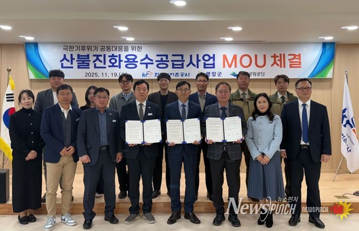 뉴스펀치 김길룡 기자 | 영암군이 19일 한국농어촌공사영암지사에서 한국농어촌공사 전남지역본부, 월출산국립공원사무소와 기후위기로 인한 대형 산불에 선제 대응하기 위해 ‘월출산 산불 진화 용수 공급사업 업무협약’을 체결했다.