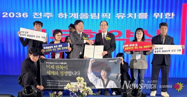 뉴스펀치 정홍균 기자 | 전북특별자치도가 22일 잠실학생체육관에서 열린 전국호남향우총연합회 정기 총회 및 화합한마당에서 '전주 하계올림픽 성공 유치를 위한 업무협약'을 체결했다.