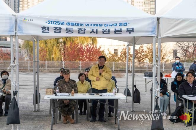 뉴스펀치 김완규 기자 | 서울 성동구는 11월 20일 마장동 한국전력 자재센터 부지에서 유관기관 합동 '2025년 생물테러 위기대응 현장훈련'을 실시했다고 밝혔다.