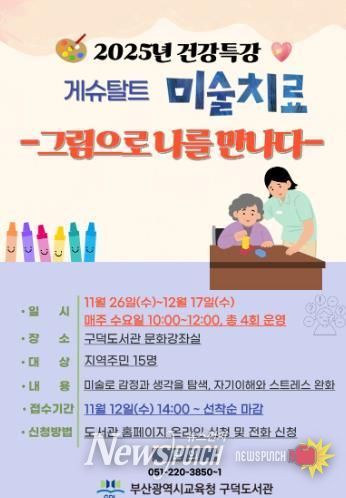 장말숙 구덕도서관장은 “이번 프로그램이 시민들이 그림을 통해 마음을 돌아보고 정서적 안정을 찾는 시간이 되길 바란다”며 “앞으로도 지역 주민의 삶의 질 향상을 위한 다양한 치유 프로그램을 운영하겠다”고 말했다.