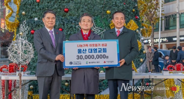 뉴스펀치 김길룡 기자 | 울산대영교회는 지난 23일 교회 앞 상방광장에서 지역 저소득 대학생과 사회복지시설 지원을 위한 성금 3천만원을 북구청에 전달했다.
