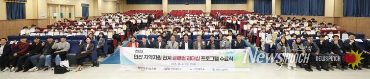 뉴스펀치 김길룡 기자 | 인천광역시교육청은 21일 고등학교 20개교 세계시민교육 동아리 학생과 교원, 학부모, 대학 지도교수, 국제기구 관계자, 하나금융TI 멘토 등 350여 명이 참석한 가운데 ‘2025 인천 지역자원 연계 글로컬 리더십 프로그램’ 수료식을 개최했다.