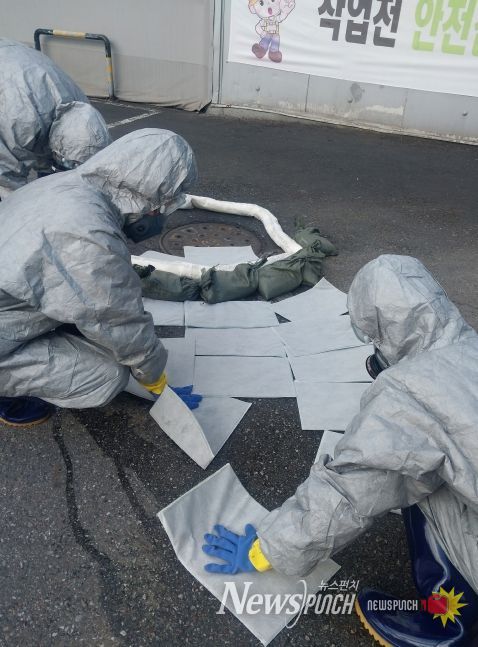 훈련에는 남동구 및 사업장 직원 등 20여 명이 참여해 보호의, 방독면 등을 착용한 상태로 케미컬 흡착포, 소석회 등을 이용한 방제작업을 진행했다.