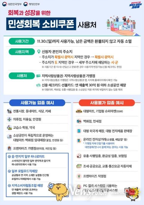 1·2차 소비쿠폰 모두 11월 30일까지 사용해야 하며, 기한이 지나면 잔액은 자동 소멸돼 사용할 수 없다. 사용처는 연 매출 30억 원 이하 소상공인 업종과 지역사랑상품권 가맹점이며, 대형마트·백화점 등 일부 업종은 사용이 제한된다.