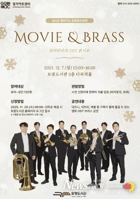 'Movie & Brass'는 오는 12월 7일(일) 오후 3시, 토평도서관 3층 다목적홀에서 브라스 앙상블 ‘코리안아츠(Korean Arts)’가 선보이는 영화 OST 콘서트로 진행된다.