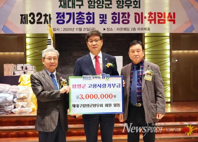 특히 이날 행사에서는 노상진 취임 회장이 고향 후배들의 꿈을 응원하며 장학금 200만 원을 (재)함양군장학회에 기탁했으며, 전국의 함양 향우들이 자발적으로 참여하는 ‘함양 고향사랑 십시일반 기부 챌린지’의 하나로 재대구 향우들이 마음을 모아 300만 원의 고향사랑기부금을 함양군에 전달하며 고향에 대한 깊은 사랑을 전했다.