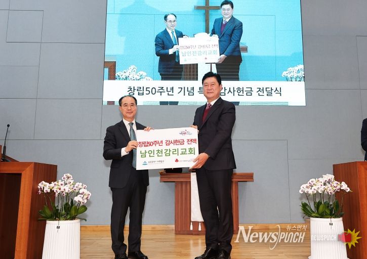 뉴스펀치 김길룡 기자 | 인천 미추홀구는 지난 23일 남인천감리교회(담임목사 이상길)로부터 창립 50주년 감사헌금 전액을 기부받았다.