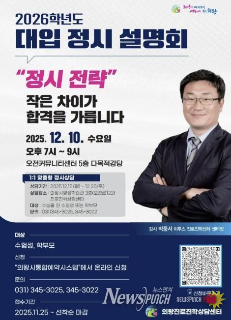 뉴스펀치 김길룡 기자 | 의왕시가 12월 10일 저녁 7시부터 오전커뮤니티센터 5층 강당에서 ‘2026학년도 대입 정시 지원전략 설명회’를 개최한다.