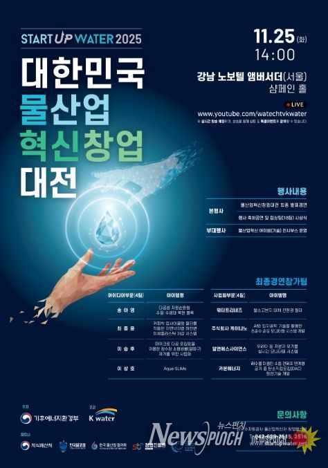 뉴스펀치 조평훈 기자 | 기후에너지환경부와 한국수자원공사는 물산업을 우리나라의 새로운 성장동력으로 성장시킬 ‘혁신형 고성장 기업(유니콘)’을 발굴하기 위해 11월 25일 노보텔앰버서더호텔(서울 강남구 소재)에서 ‘대한민국 물산업 혁신 창업대전 2025’ 최종 경연을 개최한다고 밝혔다.