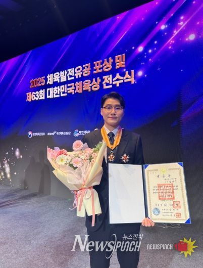 뉴스펀치 김길룡 기자 | 고양특례시 소속 직장운동경기부 세팍타크로팀의 임안수 선수가 지난 21일 서울 웨스틴조선호텔 그랜드볼룸에서 열린 ‘2025 체육발전유공 포상 및 제63회 대한민국체육상 전수식’에서 체육훈장‘맹호장’을 수훈했다.