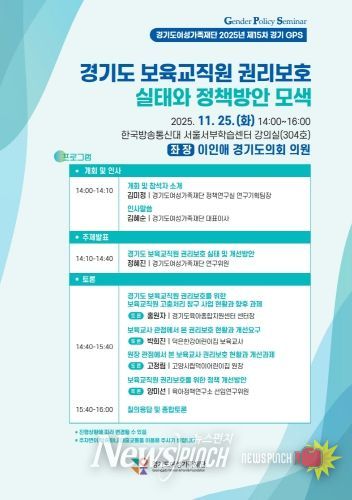 뉴스펀치 김길룡 기자 | 경기도여성가족재단은 오는 25일 오후 2시 한국방송통신대학교 서울서부학습센터에서 ‘경기도 보육교직원 권리보호 실태와 정책방안 모색’을 주제로 정책토론회를 개최한다.