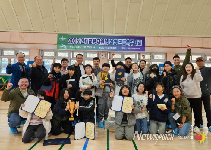 뉴스펀치 김길룡 기자 | 인제교육지원청은 11월 22일 인제초등학교 체육관에서 강원특별자치도 내 초등학교팀을 대상으로 ‘2025 인제교육지원청 학생 드론 축구대회’를 개최했다.