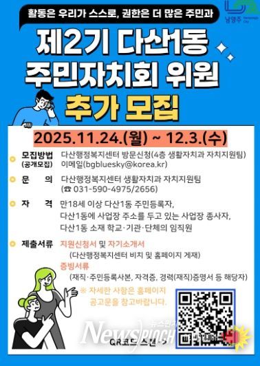 뉴스펀치 김길룡 기자 | 남양주시는 11월 24일부터 12월 3일까지 다산행정복지센터가 ‘다산1동 제2기 주민자치회’ 위원 10명을 추가 공개 모집한다고 밝혔다.