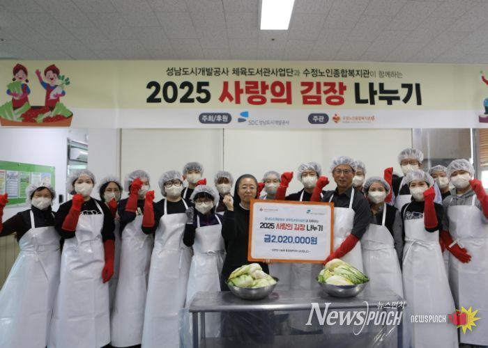 뉴스펀치 김길룡 기자 | 성남도시개발공사 체육도서관사업단은 지난 21일 관내 수정노인종합복지관에서 지역 취약계층 어르신을 지원하기 위한 ‘2025년 김장김치 나눔 봉사활동’을 실시했다고 24일 밝혔다.