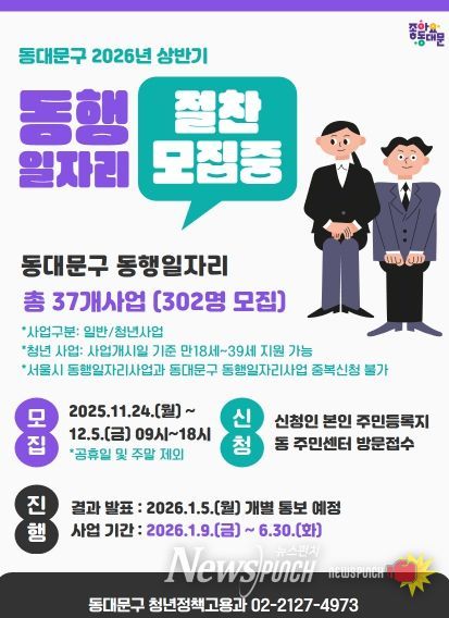 뉴스펀치 김완규 기자 | 서울 동대문구는 11월 24일부터 12월 5일까지 ‘2026년 상반기 동대문구 동행일자리사업’ 참여자 302명을 모집한다.