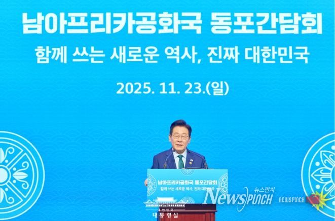 뉴스펀치 김용희 기자 | 주요 20개국(G20) 정상회의 참석을 위해 남아프리카공화국을 방문한 이재명 대통령은 23일(현지시간) 양국 수교 후 최초로 동포간담회를 개최해 현지에 거주하는 동포들을 격려했다.