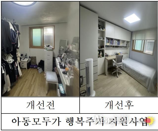 '아동모두가 행복주거 지원사업'은 아동주거빈곤가구를 대상으로 협소공간 효율성 제고, 필수설비 설치, 구조·성능 및 환경기준 개선, 사례관리 등을 지원하는 사업으로서 올해 선정 가구는 아동 독립공간 조성, 아동방 내 설치되어 있던 가스배관 이설, 냉방기 등을 지원받아 주거 안전성과 편리함이 크게 개선됐다.