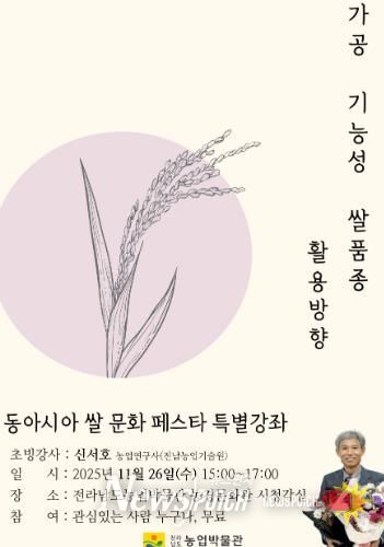 뉴스펀치 김길룡 기자 | 전라남도농업박물관은 26일 오후 3시 ‘동아시아 쌀 문화 페스타’ 다섯 번째 특별강좌를 열어 국내 대표 쌀 품종 개발 전문가를 초청해 미래 쌀 산업의 혁신 모델을 제시한다고 밝혔다.