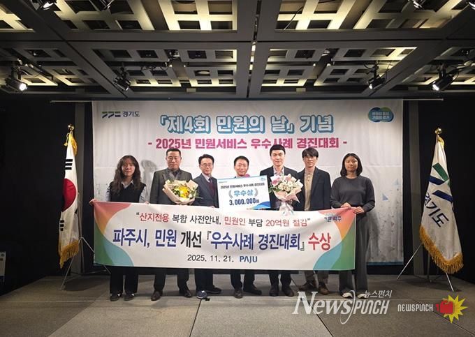 뉴스펀치 김길룡 기자 | 파주시는 지난 21일 경기도가 주최한 '2025년 민원서비스 개선 우수사례 경진대회'에서 우수상을 수상했다고 밝혔다.