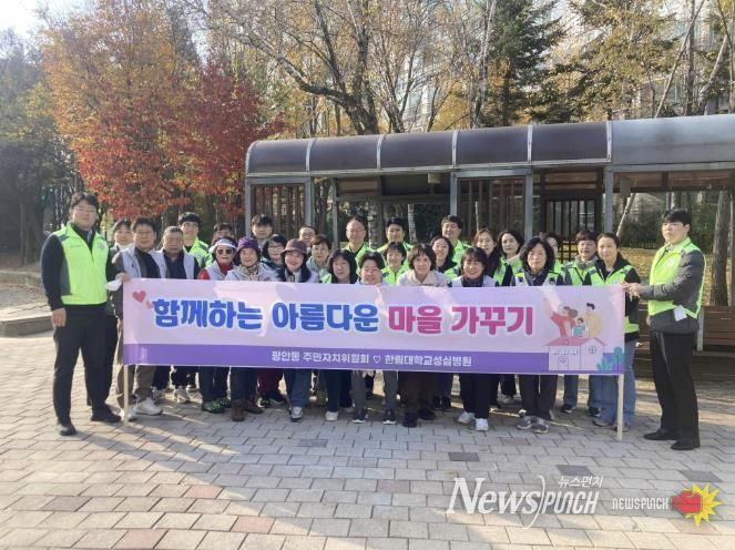 뉴스펀치 김길룡 기자 | 안양시 동안구 평안동 주민자치위원회와 한림대학교성심병원은 지난 22일 평안동 관내 주요 산책길을 돌며 낙엽쓸기 등 합동 환경정화 활동을 실시했다.