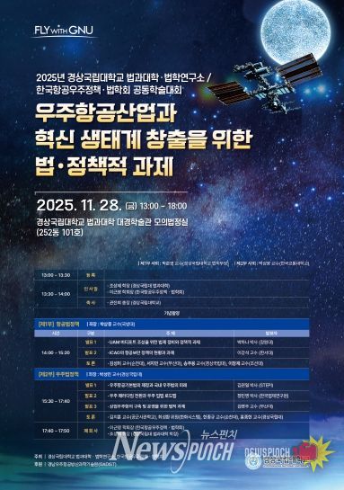 뉴스펀치 김길룡 기자 | 경상국립대학교(GNU·총장 권진회) 법과대학은 11월 28일 오후 1시 가좌캠퍼스 법과대학 대경학술관 1층 모의법정실(252동 101호)에서 ‘우주항공산업과 혁신 생태계 창출을 위한 법·정책적 과제’라는 주제로 경상국립대학교 법학연구소, 한국항공우주정책·법학회와 공동학술대회를 개최한다. 이번 학술대회는 경상국립대학교 경남우주항공방산과학기술원(GADIST)이 후원한다.