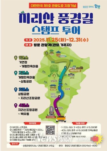 뉴스펀치 김길룡 기자 | 함양군은 대한민국 제1호 관광도로로 지정된 ‘지리산 풍경길’을 보다 즐겁게 체험할 수 있도록, 방문객 참여형 이벤트 ‘지리산 풍경길 스탬프 투어’를 운영한다고 밝혔다.