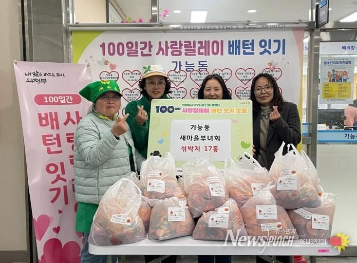 뉴스펀치 김길룡 기자 | 의정부시 가능동주민센터는 11월 21일 가능동 새마을부녀회가 정성껏 준비한 섞박지 17통(4kg 단위)을 관내 취약계층을 위해 기탁했다고 밝혔다.