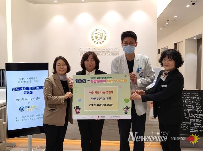 조미경 동장은 “100일간 사랑릴레이에 참여해주신 연세리더스 신경외과의원에 진심으로 감사드린다”며 “기부해주신 라면은 도움이 필요한 가정에 소중히 전달해 따뜻한 겨울을 보낼 수 있도록 하겠다”고 말했다.