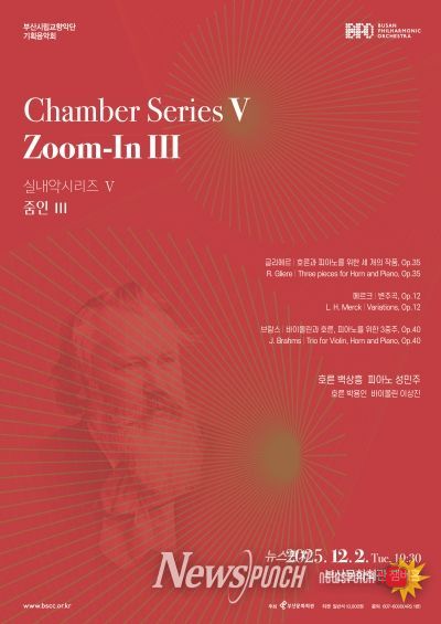 뉴스펀치 김길룡 기자 | 부산시립교향악단(수석객원지휘자 홍석원)의 실내악 시리즈 '줌인'의 세 번째 무대가 오는 12월 2일 부산문화회관 챔버홀 무대에 오른다.