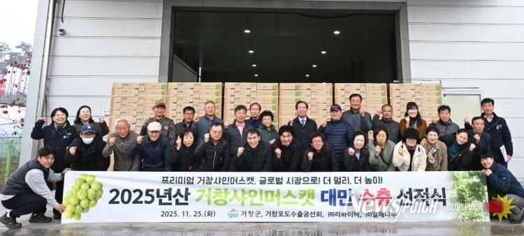 뉴스펀치 김길룡 기자 | 거창군은 지난 25일, 서북부경남거점산지유통센터(APC) 포도 선별장에서 구인모 군수를 비롯해 ㈜열매나무 대표, 포도 수출 농가 등 30여 명이 참석한 가운데 거창 샤인머스캣 대만 수출 선적식을 가졌다.
