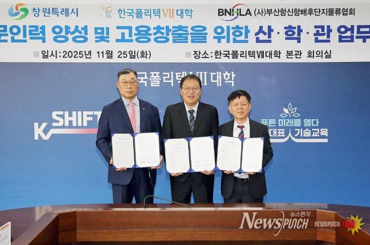 뉴스펀치 김길룡 기자 | 부산항신항과 진해신항 개항으로 항만·물류산업의 급속한 성장에 따라, 25일 한국폴리텍Ⅶ대학 창원캠퍼스에서 ㈔부산항신항배후단지물류협회와 한국폴리텍Ⅶ대학 창원캠퍼스, 창원특례시가 ‘항만·물류 전문 인력 양성을 위한 업무협약(MOU)’을 체결했다.